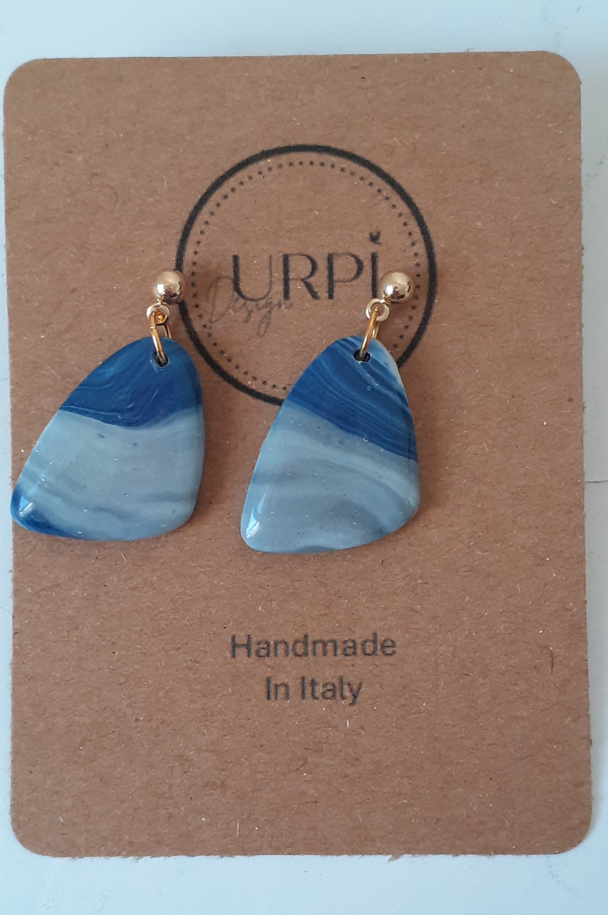 Orecchini fatti interamente a mano con pasta polimerica blu e bianco effetto pietra, free nickel e acciaio inossidabile. Un accessorio elegante e vivace, ideale per fare un regalo speciale ma anche per indossare in tutte le occasioni.